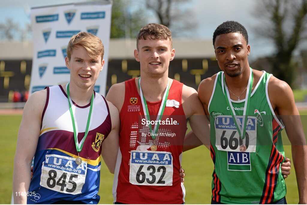 16 April 2016; Medal winners in the Mens 200M final, Kieran Elliott, University of Limerick, 2nd, Marcus Lawler, IT Carlow, 1st and Christopher Sibanda, Limerick IT, 3rd. Irish Universities Athletic Association Track & Field Championships 2016, Day 1. Morton Stadium, Santry, Co. Dublin. Picture credit: Oliver McVeigh / SPORTSFILE