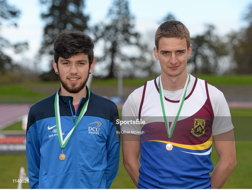 16 April 2016; Medal winners in the Mens 1500M final, Kevin Kelly, DCU, 1st and Kevin Chesser, University of Limerick, 3rd. Irish Universities Athletic Association Track & Field Championships 2016, Day 1. Morton Stadium, Santry, Co. Dublin. Picture credit: Oliver McVeigh / SPORTSFILE