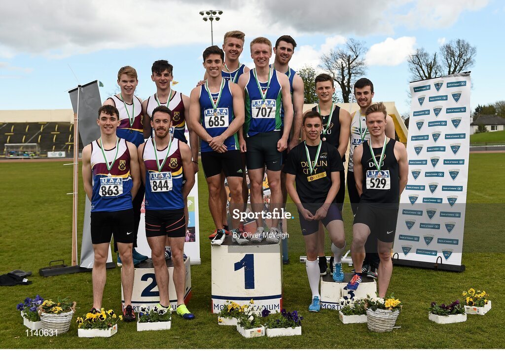 16 April 2016; Medal winning teams in the Mens 4*100M relay final, University of Limerick, left, 2nd, Queens University Belfast, centre, 1st and DCU, right, 3rd. Irish Universities Athletic Association Track & Field Championships 2016, Day 1. Morton Stadium, Santry, Co. Dublin. Picture credit: Oliver McVeigh / SPORTSFILE