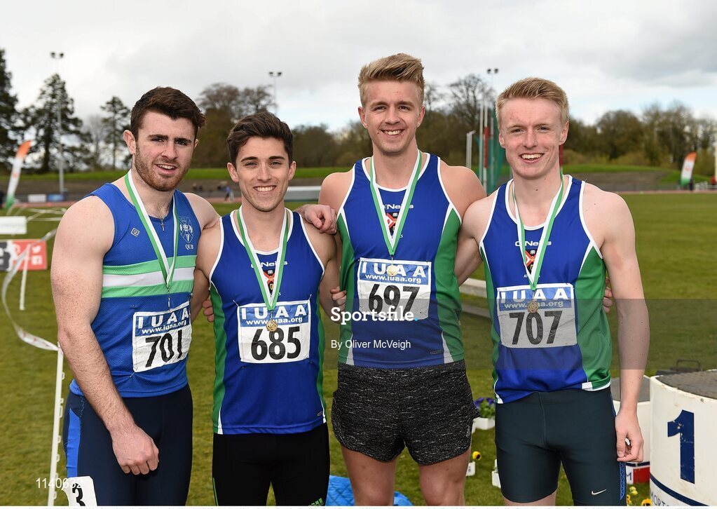 16 April 2016; The winning Queens University Belfast team of the Mens 4*100M final, Andrew Mellon, Jonathan Browning, Ben Maze, Gareth Thompson. Irish Universities Athletic Association Track & Field Championships 2016, Day 1. Morton Stadium, Santry, Co. Dublin. Picture credit: Oliver McVeigh / SPORTSFILE