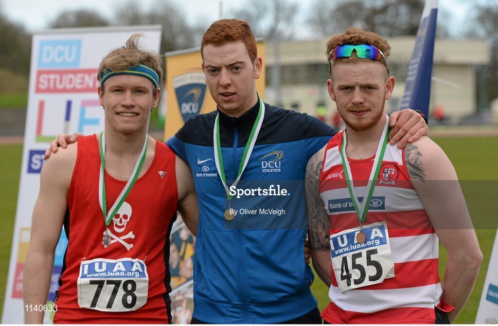 16 April 2016; Medal winners in the Mens 3000M walk final, Ruairi O'Cinneide, UCC, 2nd, Nickolas Dunphy, DCU, 1st and TJ Hogan, Cork IT, 3rd. Irish Universities Athletic Association Track & Field Championships 2016, Day 1. Morton Stadium, Santry, Co. Dublin. Picture credit: Oliver McVeigh / SPORTSFILE