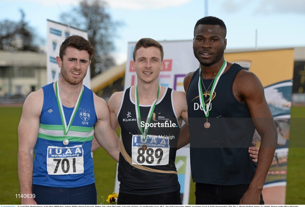 16 April 2016; Medal winners in the Mens 400M final, Andrew Mellon, Queens University, Belfast, 2nd, Adam McCombe, University of Ulster, 1st and Brandon Arrey, DCU, 3rd. Irish Universities Athletic Association Track & Field Championships 2016, Day 1. Morton Stadium, Santry, Co. Dublin. Picture credit: Oliver McVeigh / SPORTSFILE