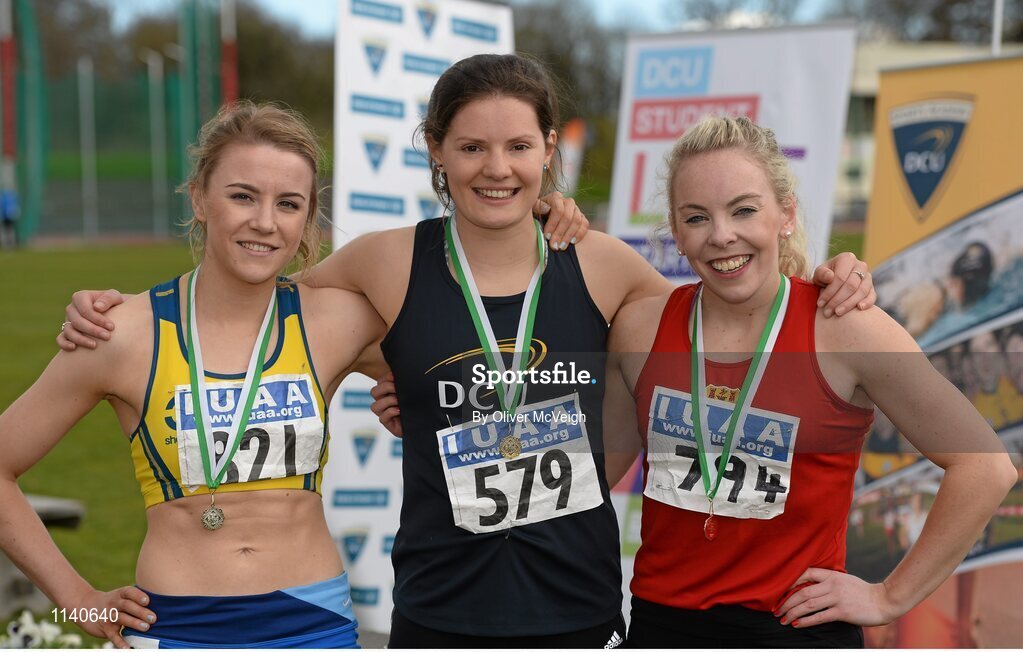16 April 2016; Medal winners in the Womens 400M final, Aisling Drumgoole, UCD, 2nd, Grainne Moynihan, DCU, 1st and Christine Neville, UCC, 3rd. Irish Universities Athletic Association Track & Field Championships 2016, Day 1. Morton Stadium, Santry, Co. Dublin. Picture credit: Oliver McVeigh / SPORTSFILE