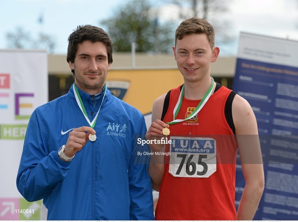 16 April 2016; Medal winners in the Mens High Jump final, Andrew Heney, Athlone IT, 2nd, and David Cussen, UCC,1st . Irish Universities Athletic Association Track & Field Championships 2016, Day 1. Morton Stadium, Santry, Co. Dublin. Picture credit: Oliver McVeigh / SPORTSFILE