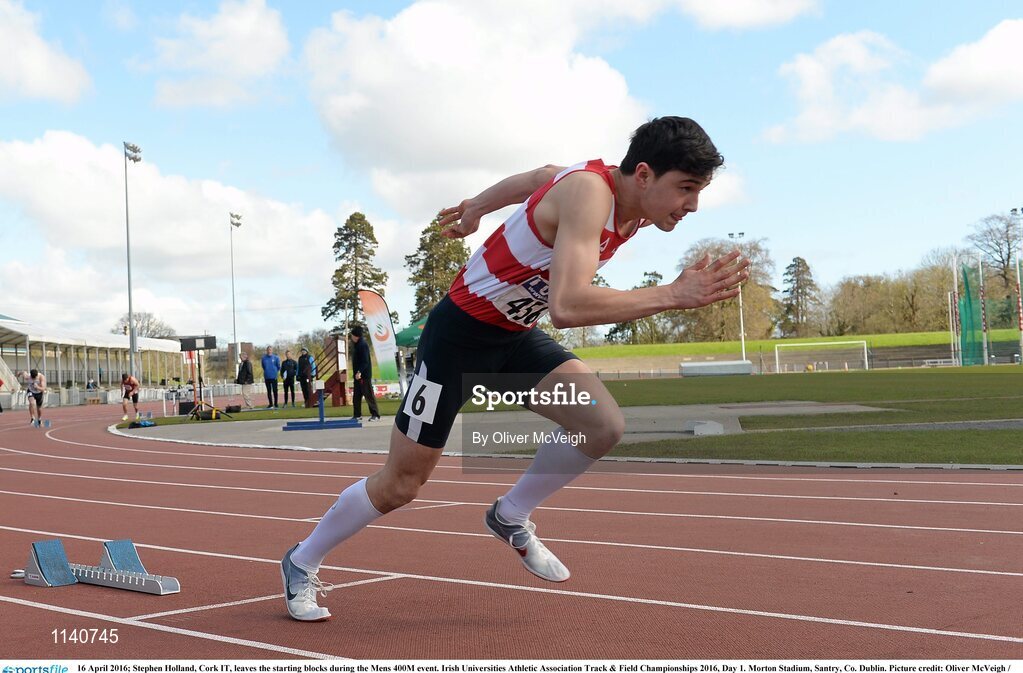16 April 2016; Stephen Holland, Cork IT, leaves the starting blocks during the Mens 400M event. Irish Universities Athletic Association Track & Field Championships 2016, Day 1. Morton Stadium, Santry, Co. Dublin. Picture credit: Oliver McVeigh / SPORTSFILE