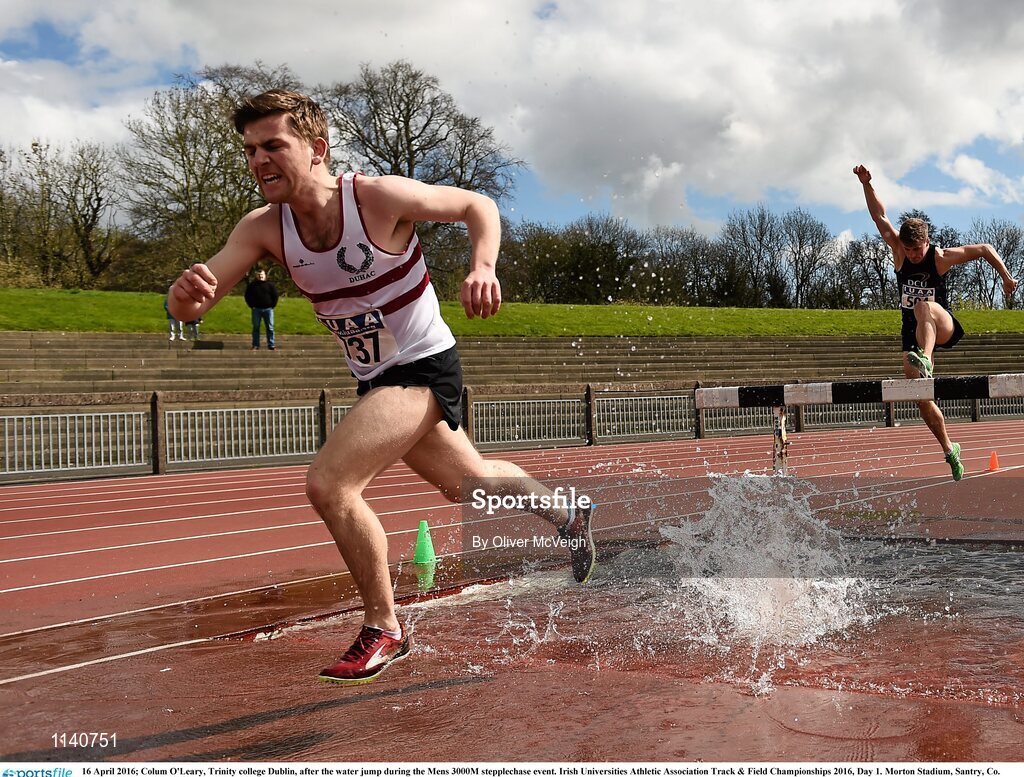 16 April 2016; Colum O'Leary, Trinity college Dublin, after the water jump during the Mens 3000M stepplechase event. Irish Universities Athletic Association Track & Field Championships 2016, Day 1. Morton Stadium, Santry, Co. Dublin. Picture credit: Oliver McVeigh / SPORTSFILE