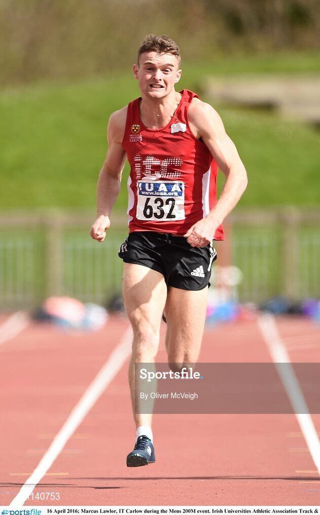 16 April 2016; Marcus Lawlor, IT Carlow during the Mens 200M event. Irish Universities Athletic Association Track & Field Championships 2016, Day 1. Morton Stadium, Santry, Co. Dublin. Picture credit: Oliver McVeigh / SPORTSFILE