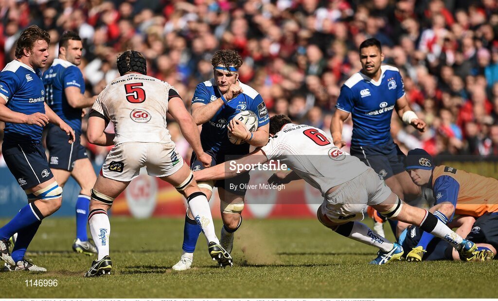 30 April 2016; Jamie Heaslip, Leinster, is tackled by Iain Henderson, Ulster. Guinness PRO12, Round 21, Ulster v Leinster, Kingspan Stadium, Ravenhill Park, Belfast, Co. Antrim. Picture credit: Oliver McVeigh / SPORTSFILE