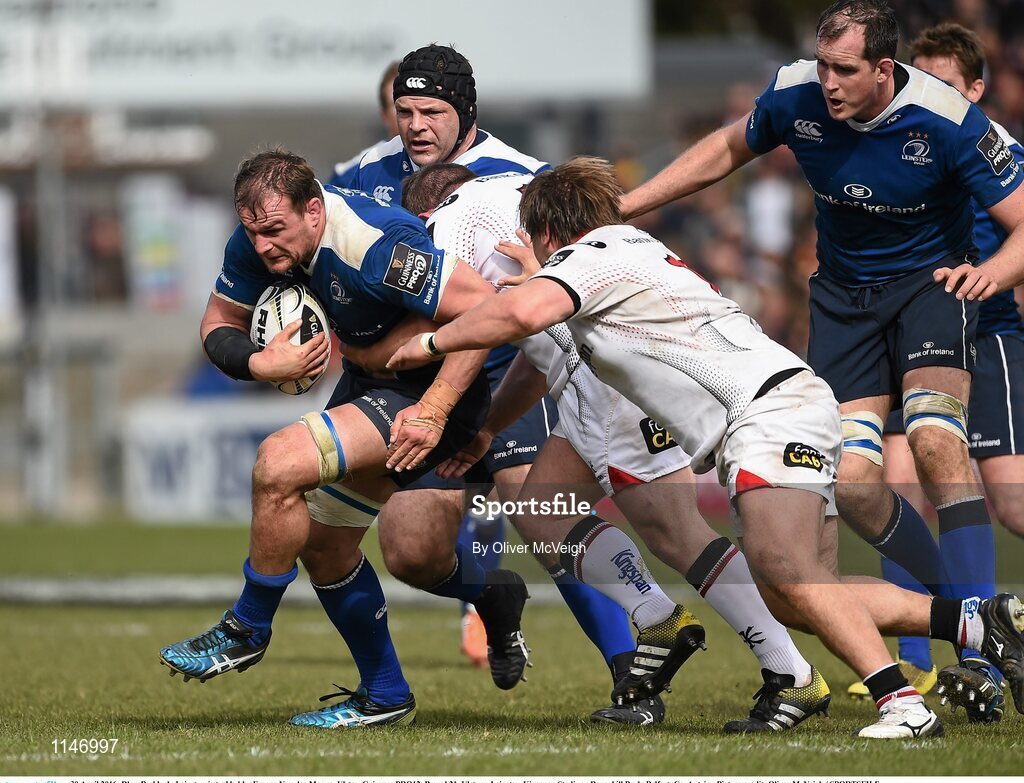 30 April 2016; Rhys Ruddock, Leinster, is tackled by Franco Van der Merwe, Ulster. Guinness PRO12, Round 21, Ulster v Leinster, Kingspan Stadium, Ravenhill Park, Belfast, Co. Antrim. Picture credit: Oliver McVeigh / SPORTSFILE