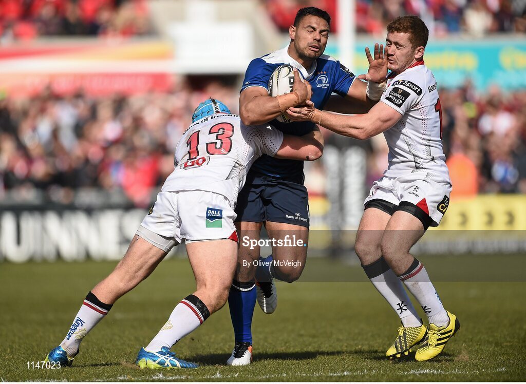 30 April 2016; Ben Te’o, Leinster, is tackled by Luke Marshall and Paddy Jackson, Ulster. Guinness PRO12, Round 21, Ulster v Leinster, Kingspan Stadium, Ravenhill Park, Belfast, Co. Antrim. Picture credit: Oliver McVeigh / SPORTSFILE