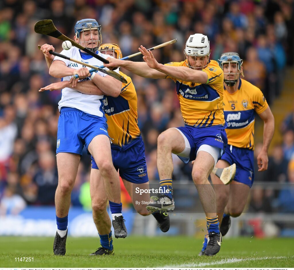 1 May 2016; Patrick Curran, Waterford, in action against Cian Dillon and Pat O'Connor, right, Clare. Allianz Hurling League Division 1 Final, Clare v Waterford. Semple Stadium, Thurles, Co. Tipperary. Picture credit: Stephen McCarthy / SPORTSFILE