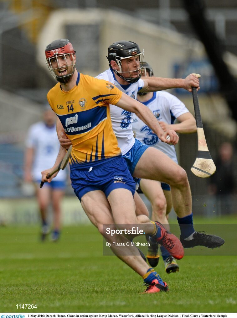 1 May 2016; Darach Honan, Clare, in action against Kevin Moran, Waterford. Allianz Hurling League Division 1 Final, Clare v Waterford. Semple Stadium, Thurles, Co. Tipperary. Picture credit: Piaras Ó Mídheach / SPORTSFILE