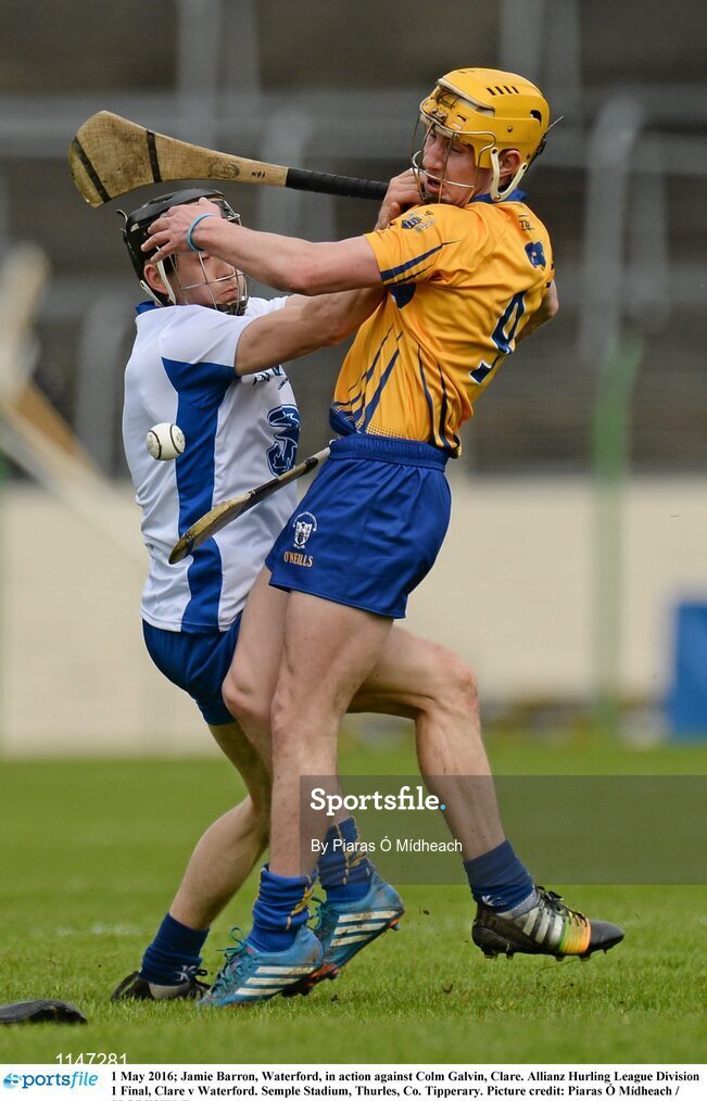 1 May 2016; Jamie Barron, Waterford, in action against Colm Galvin, Clare. Allianz Hurling League Division 1 Final, Clare v Waterford. Semple Stadium, Thurles, Co. Tipperary. Picture credit: Piaras Ó Mídheach / SPORTSFILE