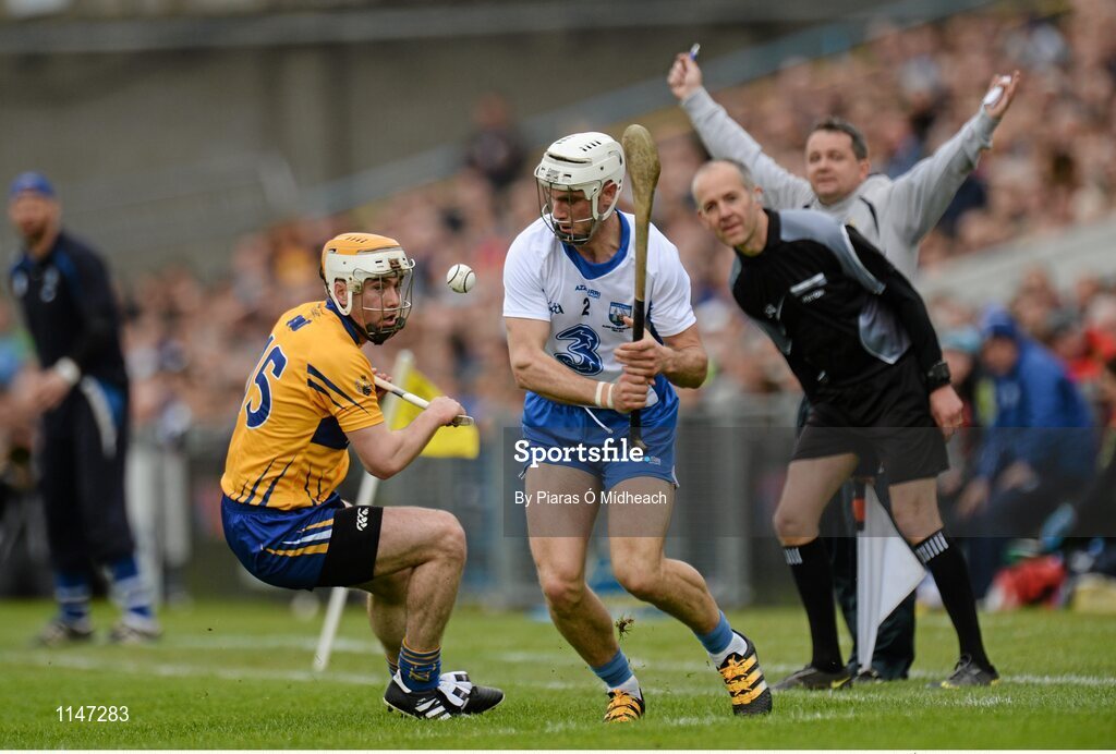 1 May 2016; Shane Fives, Waterford, in action against Conor McGrath, Clare, as Clare manager Davy Fitzgerald and linesman Cathal McAllister look on. Allianz Hurling League Division 1 Final, Clare v Waterford. Semple Stadium, Thurles, Co. Tipperary. Picture credit: Piaras Ó Mídheach / SPORTSFILE