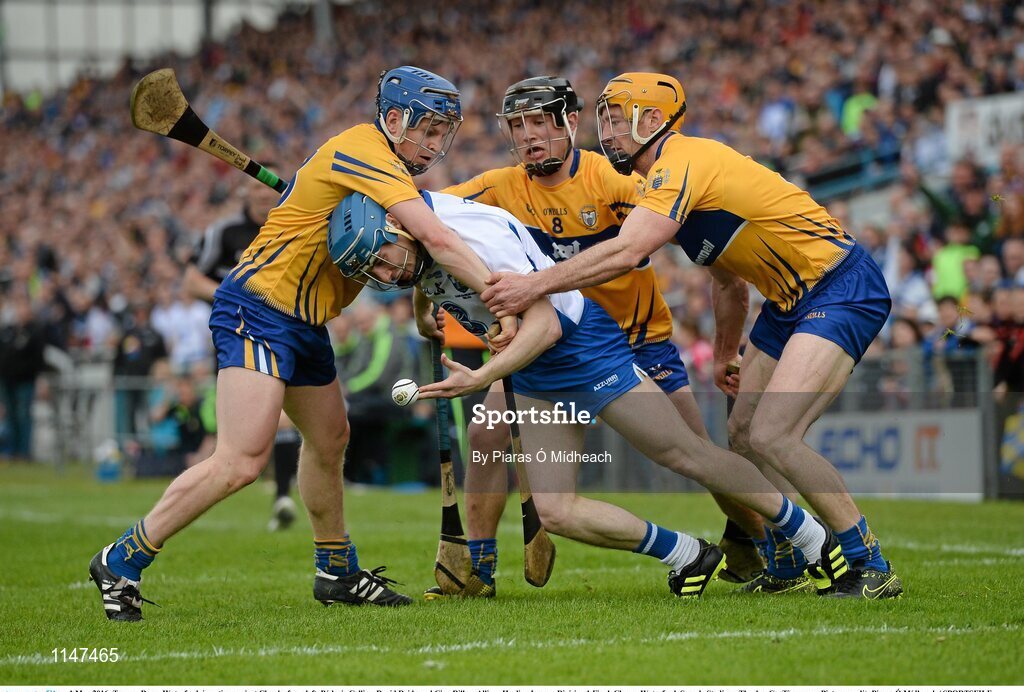 1 May 2016; Tommy Ryan, Waterford, in action against Clare's, from left, Pádraic Collins, David Reidy and Cian Dillon. Allianz Hurling League Division 1 Final, Clare v Waterford. Semple Stadium, Thurles, Co. Tipperary. Picture credit: Piaras Ó Mídheach / SPORTSFILE