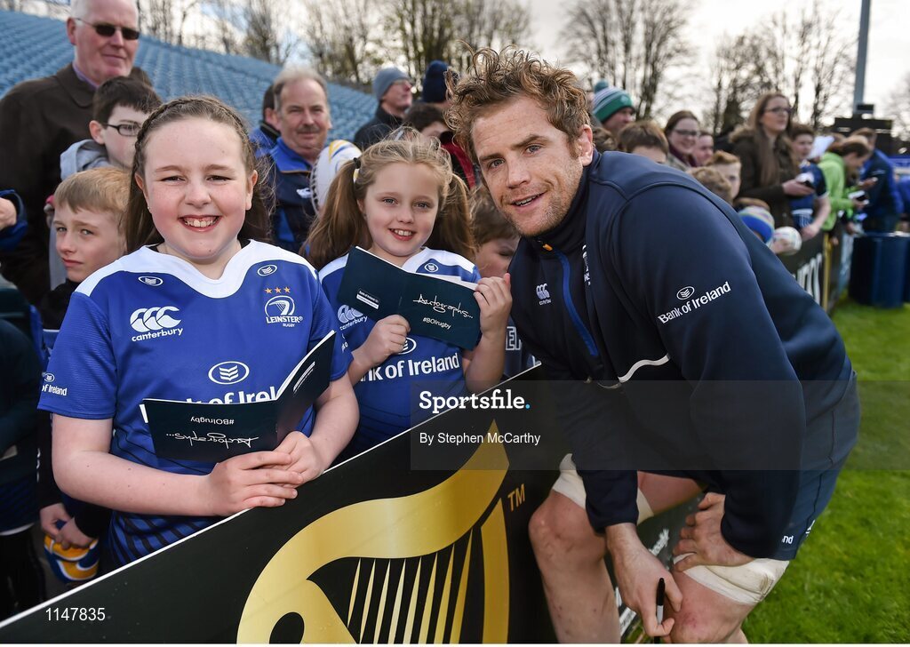 2 May 2016; Leinster's Jamie Heaslip meets supporters Ella Murphy, from Sandymount, Dublin, left, and Carla Woods, from Docklands, Dublin, both aged 10, following an open session training at the RDS, Ballsbridge, Dublin. Picture credit: Stephen McCarthy / SPORTSFILE