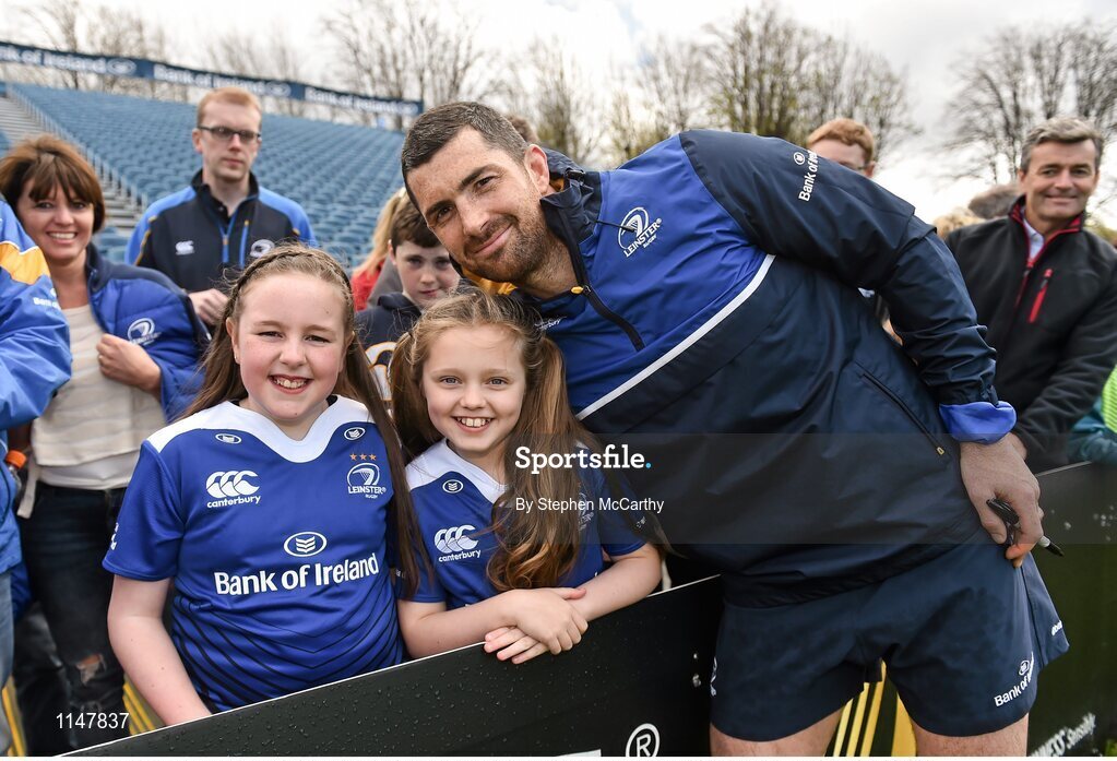 2 May 2016; Leinster's Rob Kearney meets supporters Ella Murphy, from Sandymount, Dublin, left, and Carla Woods, from Docklands, Dublin, both aged 10, following an open session training at the RDS, Ballsbridge, Dublin. Picture credit: Stephen McCarthy / SPORTSFILE