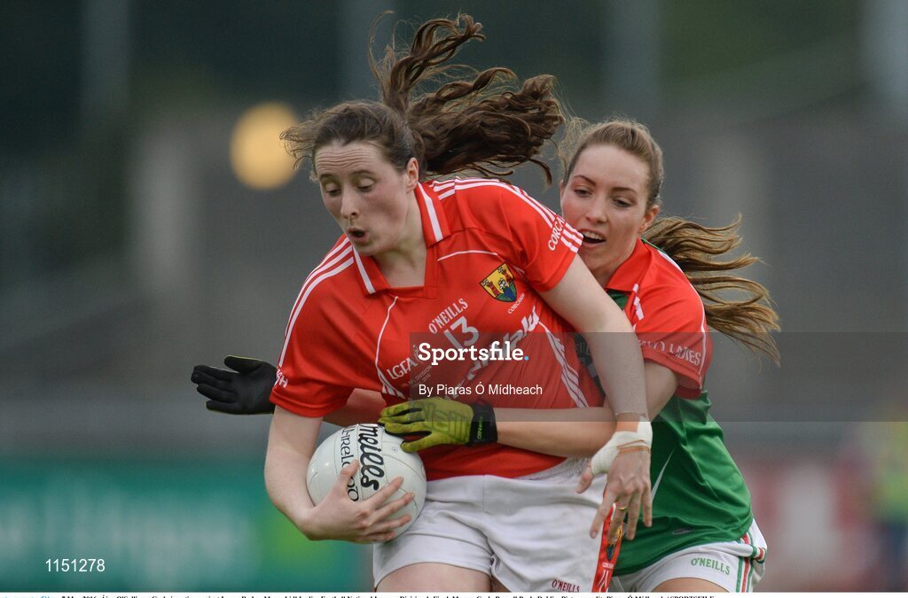 7 May 2016; Áine O'Sullivan, Cork, in action against Leona Ryder, Mayo. Lidl Ladies Football National League, Division 1, Final, Mayo v Cork. Parnell Park, Dublin. Picture credit: Piaras Ó Mídheach / SPORTSFILE
