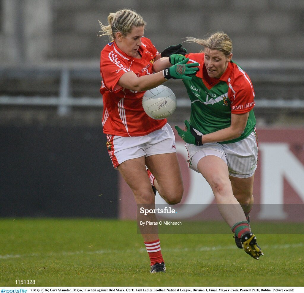 7 May 2016; Cora Staunton, Mayo, in action against Bríd Stack, Cork. Lidl Ladies Football National League, Division 1, Final, Mayo v Cork. Parnell Park, Dublin. Picture credit: Piaras Ó Mídheach / SPORTSFILE