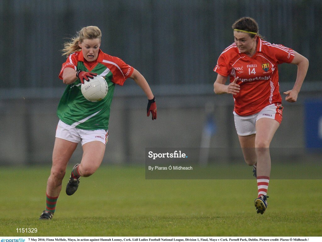 7 May 2016; Fiona McHale, Mayo, in action against Hannah Looney, Cork. Lidl Ladies Football National League, Division 1, Final, Mayo v Cork. Parnell Park, Dublin. Picture credit: Piaras Ó Mídheach / SPORTSFILE