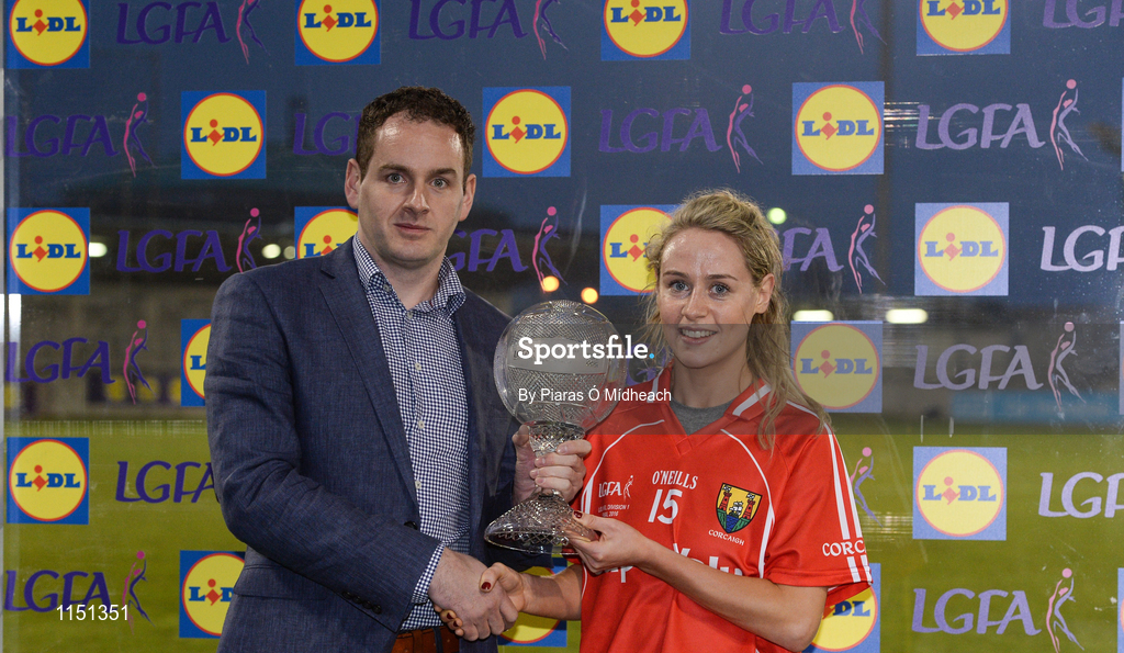 7 May 2016; Orla Finn, Cork, is presented with her player of the match award by John Paul Scally, Managing Director, Lidl. Lidl Ladies Football National League, Division 1, Final, Mayo v Cork. Parnell Park, Dublin. Picture credit: Piaras Ó Mídheach / SPORTSFILE
