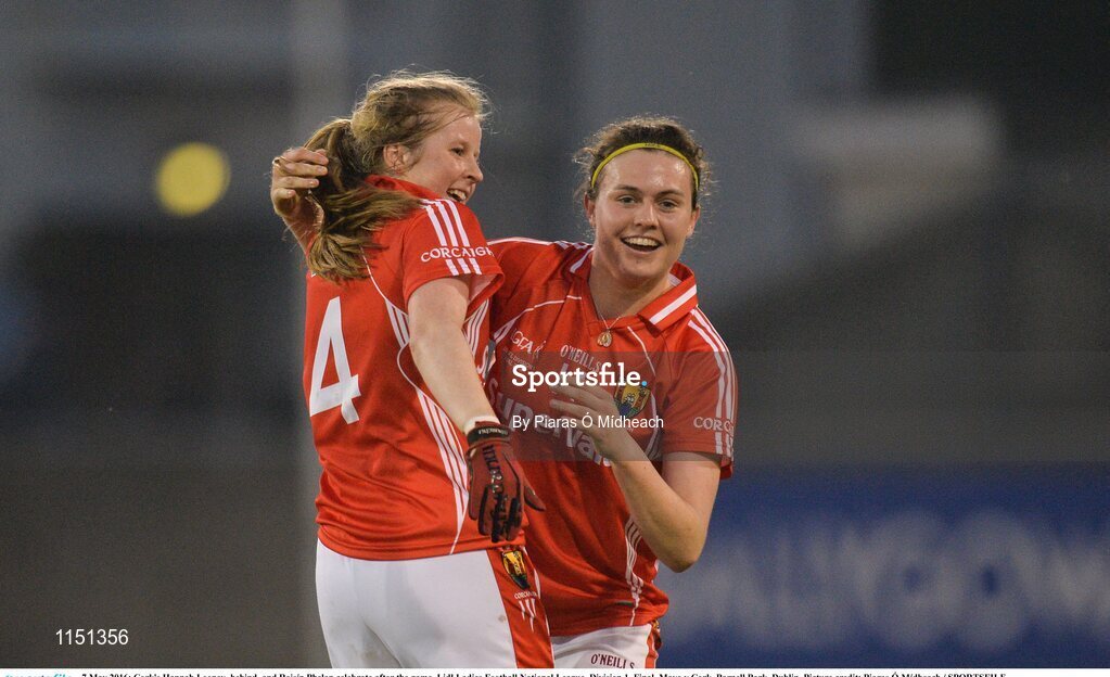 7 May 2016; Cork's Hannah Looney, behind, and Roisín Phelan celebrate after the game. Lidl Ladies Football National League, Division 1, Final, Mayo v Cork. Parnell Park, Dublin. Picture credit: Piaras Ó Mídheach / SPORTSFILE