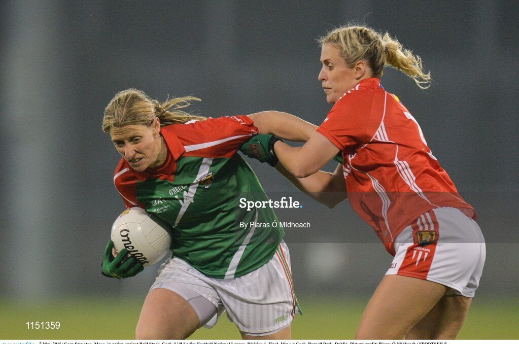 7 May 2016; Cora Staunton, Mayo, in action against Bríd Stack, Cork. Lidl Ladies Football National League, Division 1, Final, Mayo v Cork. Parnell Park, Dublin. Picture credit: Piaras Ó Mídheach / SPORTSFILE