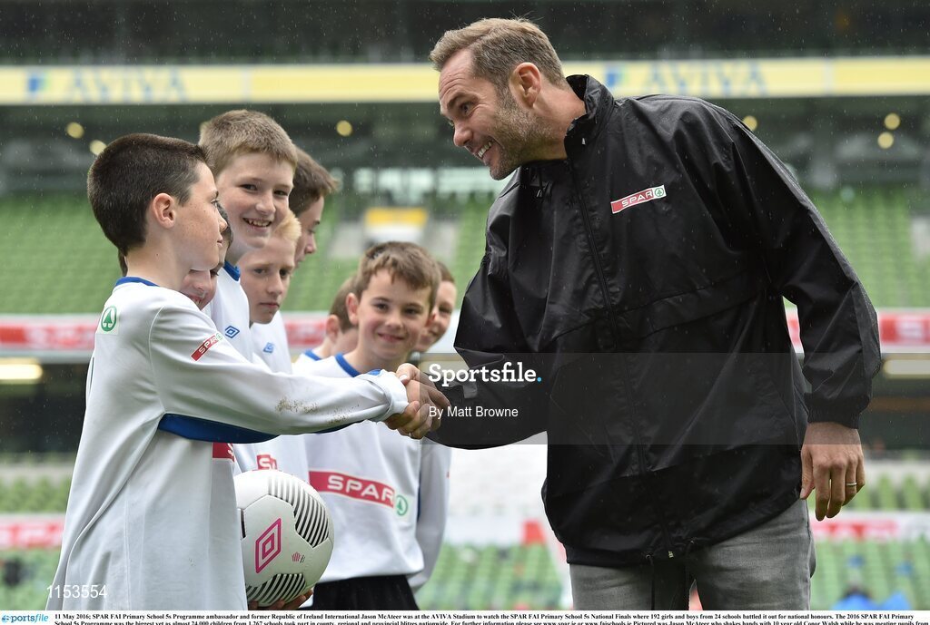 11 May 2016; SPAR FAI Primary School 5s Programme ambassador and former Republic of Ireland International Jason McAteer was at the AVIVA Stadium to watch the SPAR FAI Primary School 5s National Finals where 192 girls and boys from 24 schools battled it out for national honours. The 2016 SPAR FAI Primary School 5s Programme was the biggest yet as almost 24,000 children from 1,267 schools took part in county, regional and provincial blitzes nationwide. For further information please see www.spar.ie or www.faischools.ie Pictured was Jason McAteer who shakes hands with 10 year old Conor Walsh while he was meating pupils from Carns NS, Co. Sligo. Aviva Stadium, Dublin. Picture credit: Matt Browne / SPORTSFILE