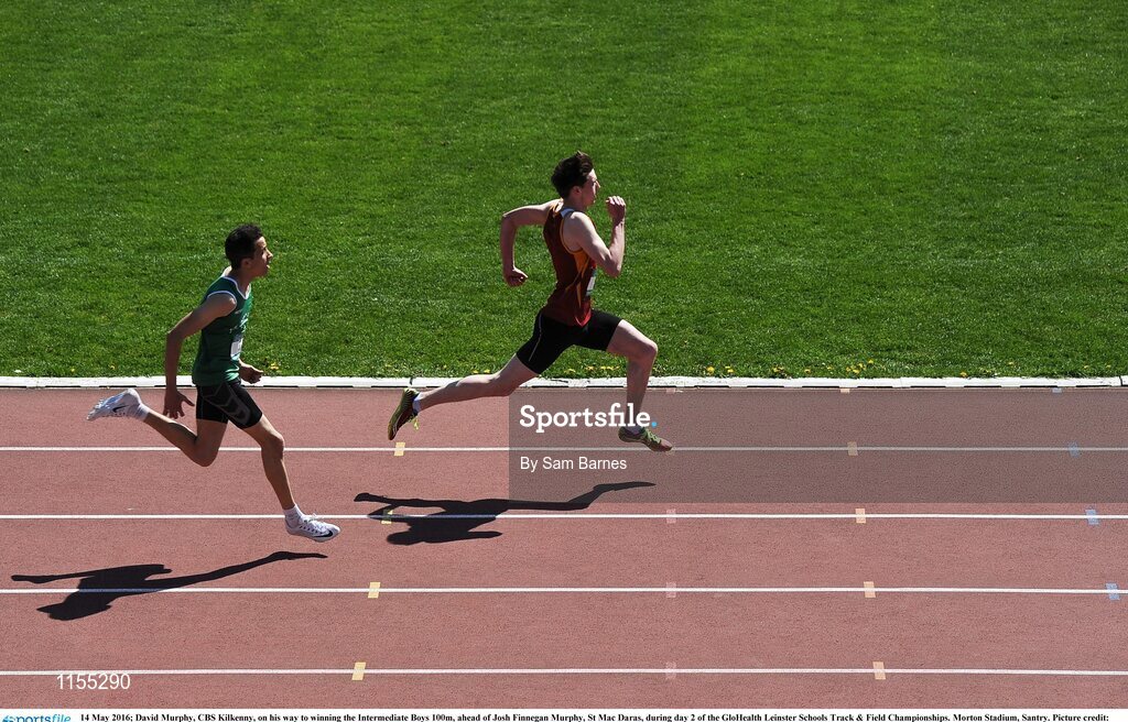 14 May 2016; David Murphy, CBS Kilkenny, on his way to winning the Intermediate Boys 100m, ahead of Josh Finnegan Murphy, St Mac Daras, during day 2 of the GloHealth Leinster Schools Track & Field Championships. Morton Stadium, Santry. Picture credit: Sam Barnes / SPORTSFILE