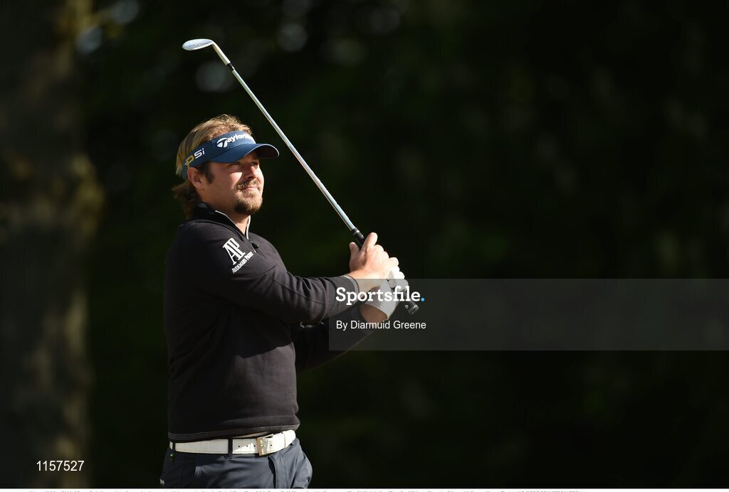 18 May 2016; Victor Dubuisson plays from a bunker at the 10th green during the Dubai Duty Free Irish Open Golf Championship Pro-Am at The K Club in Straffan, Co. Kildare. Photo by Diarmuid Greene/Sportsfile