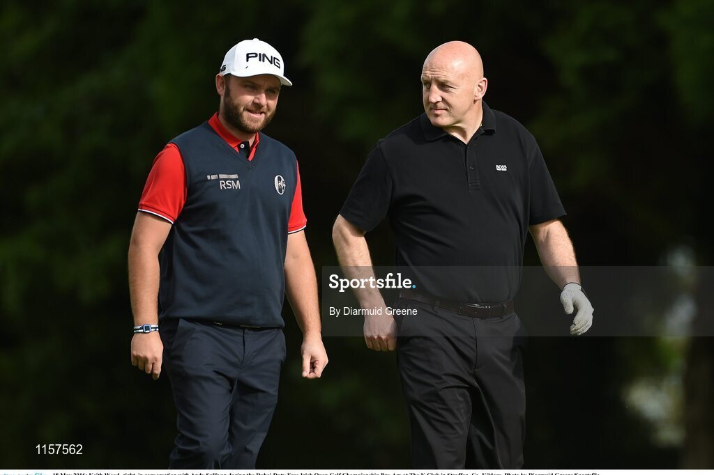 18 May 2016; Keith Wood, right, in conversation with Andy Sullivan during the Dubai Duty Free Irish Open Golf Championship Pro-Am at The K Club in Straffan, Co. Kildare. Photo by Diarmuid Greene/Sportsfile