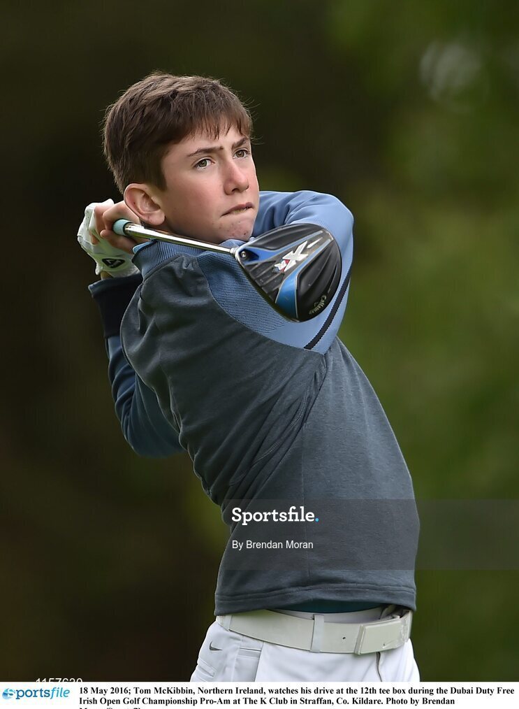 18 May 2016; Thirteen year old Tom McKibbin, from Antrim, who was invited to play in the Pro Am at the Dubai Duty Free Irish Open by golfer Rory McIlroy, on the 12th tee box during the Dubai Duty Free Irish Open Golf Championship Pro-Am at The K Club in Straffan, Co. Kildare. Photo by Brendan Moran/Sportsfile