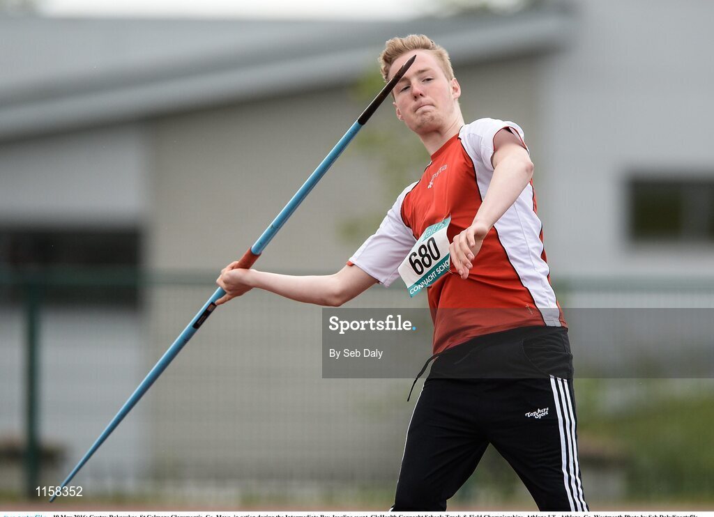 19 May 2016; Gustav Rakauskas, St Colmans Claremorris, Co. Mayo, in action during the Intermediate Boy Javeline event. GloHealth Connacht Schools Track & Field Championships, Athlone I.T., Athlone, Co. Westmeath Photo by Seb Daly/Sportsfile