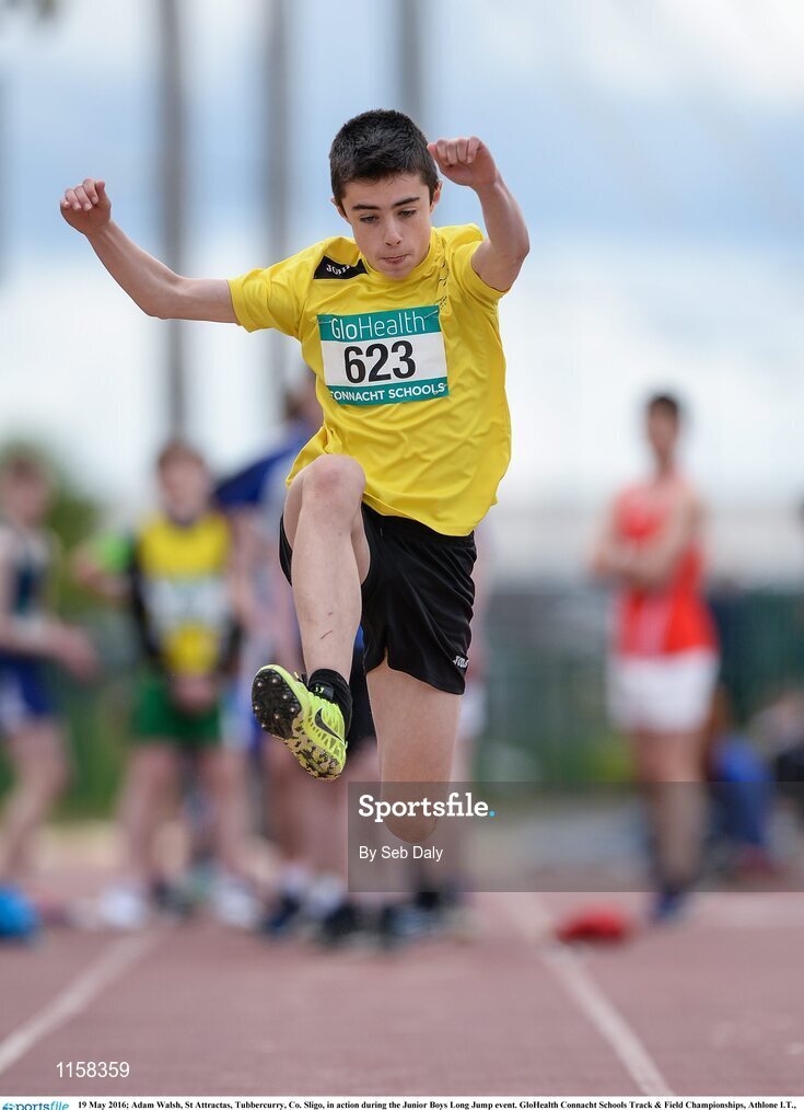 19 May 2016; Adam Walsh, St Attractas, Tubbercurry, Co. Sligo, in action during the Junior Boys Long Jump event. GloHealth Connacht Schools Track & Field Championships, Athlone I.T., Athlone, Co. Westmeath Photo by Seb Daly/Sportsfile