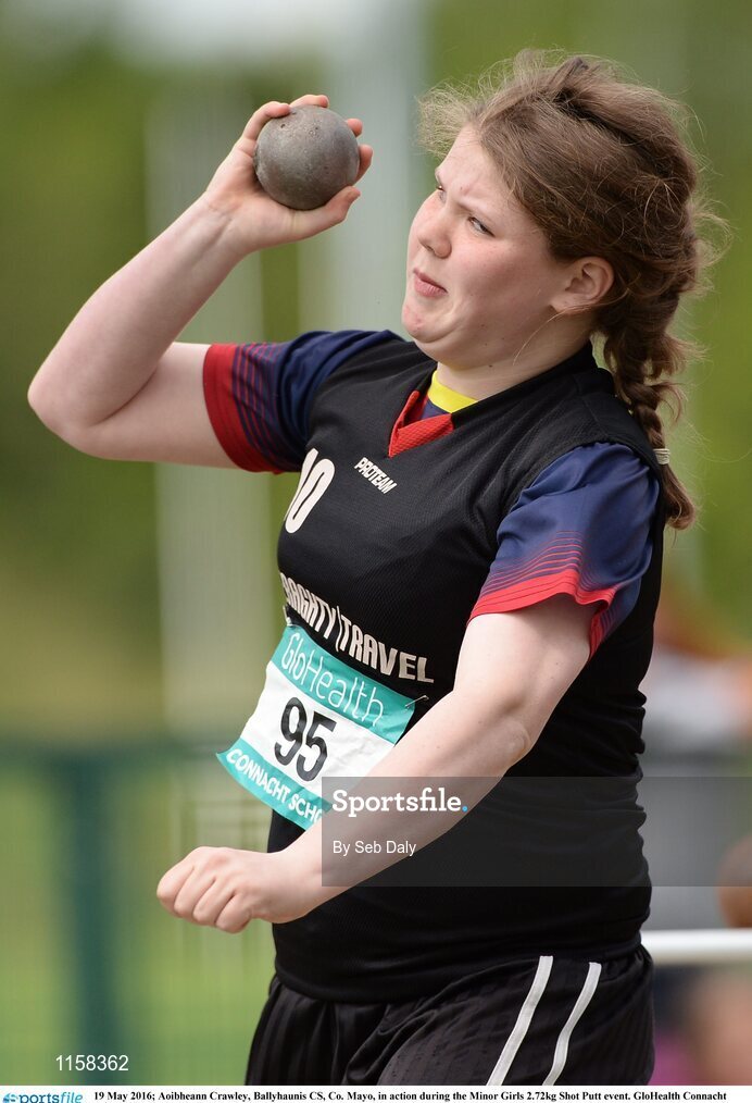 19 May 2016; Aoibheann Crawley, Ballyhaunis CS, Co. Mayo, in action during the Minor Girls 2.72kg Shot Putt event. GloHealth Connacht Schools Track & Field Championships, Athlone I.T., Athlone, Co. Westmeath Photo by Seb Daly/Sportsfile