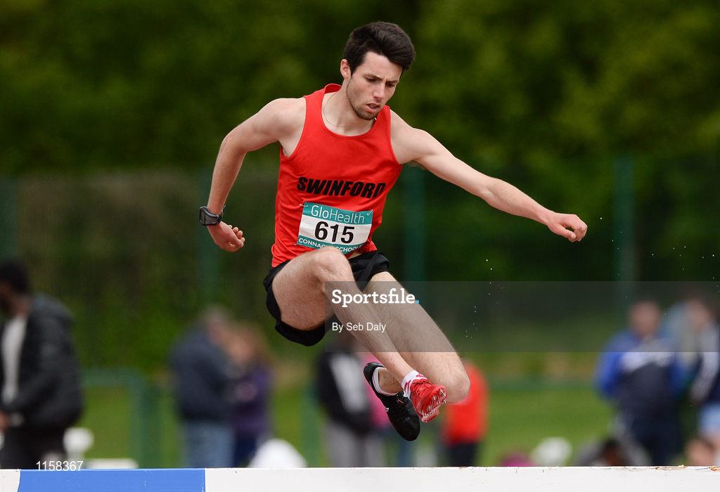 19 May 2016; Tadhg McGinty, SM&P, Swinford, Co. Mayo, in action during the Senior Boys 2000m Steeplechase event. GloHealth Connacht Schools Track & Field Championships, Athlone I.T., Athlone, Co. Westmeath Photo by Seb Daly/Sportsfile