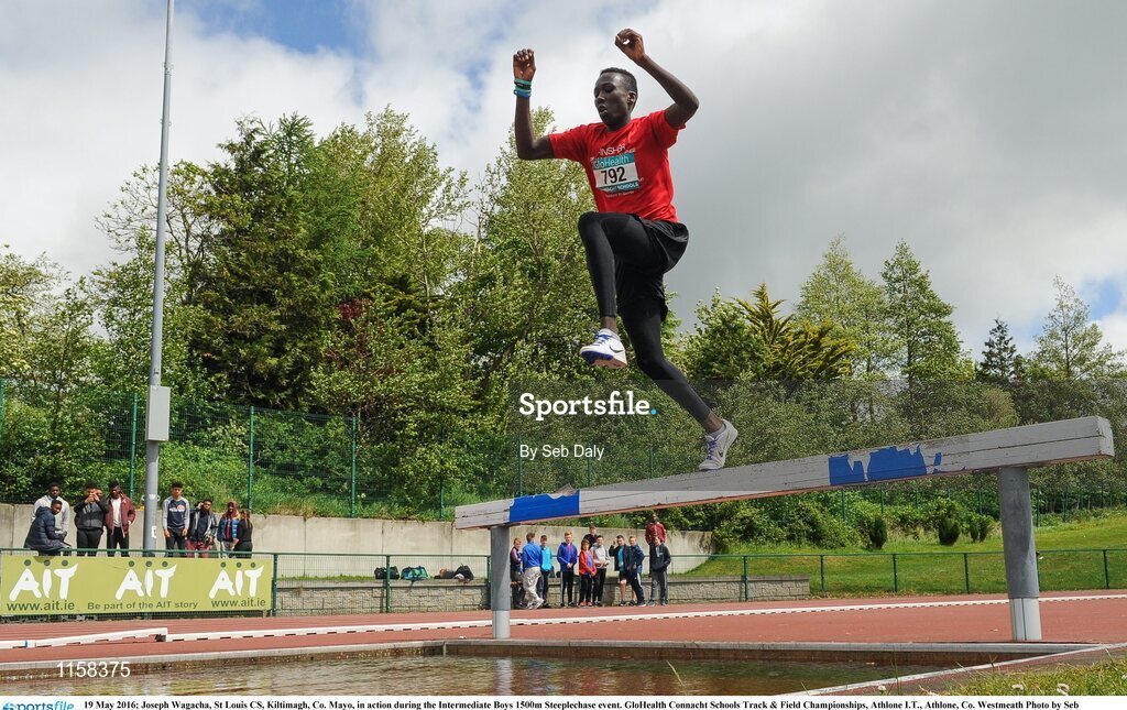 19 May 2016; Joseph Wagacha, St Louis CS, Kiltimagh, Co. Mayo, in action during the Intermediate Boys 1500m Steeplechase event. GloHealth Connacht Schools Track & Field Championships, Athlone I.T., Athlone, Co. Westmeath Photo by Seb Daly/Sportsfile