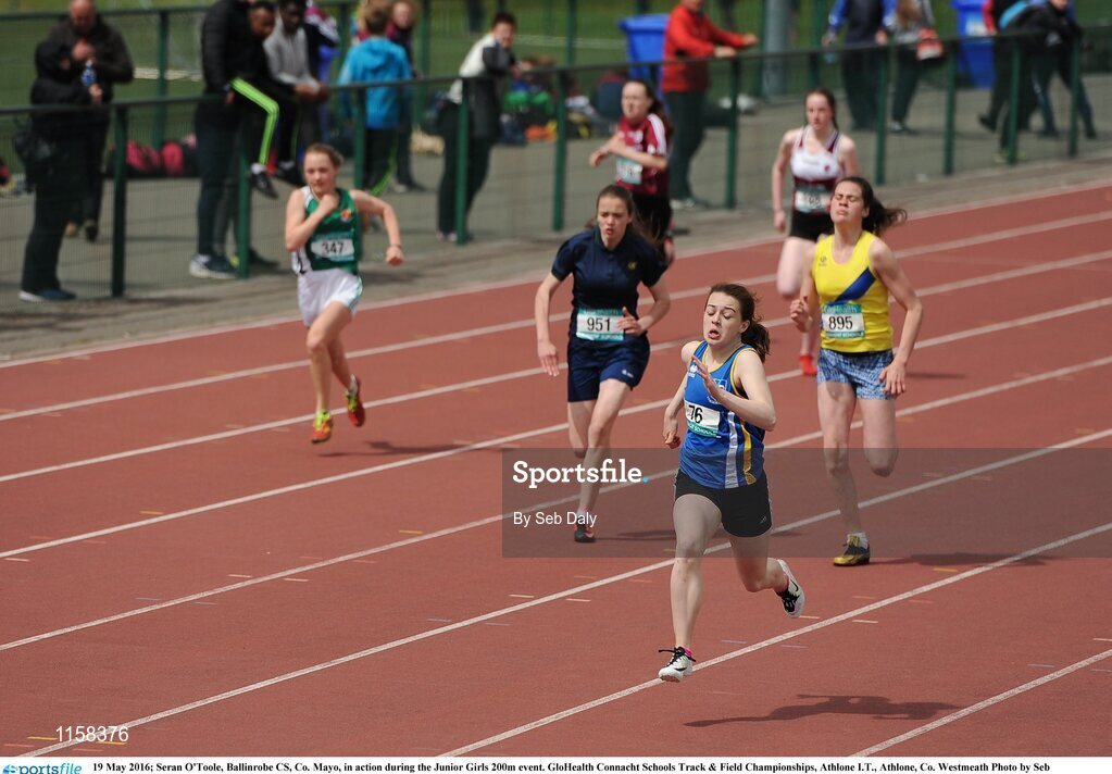 19 May 2016; Seran O'Toole, Ballinrobe CS, Co. Mayo, in action during the Junior Girls 200m event. GloHealth Connacht Schools Track & Field Championships, Athlone I.T., Athlone, Co. Westmeath Photo by Seb Daly/Sportsfile