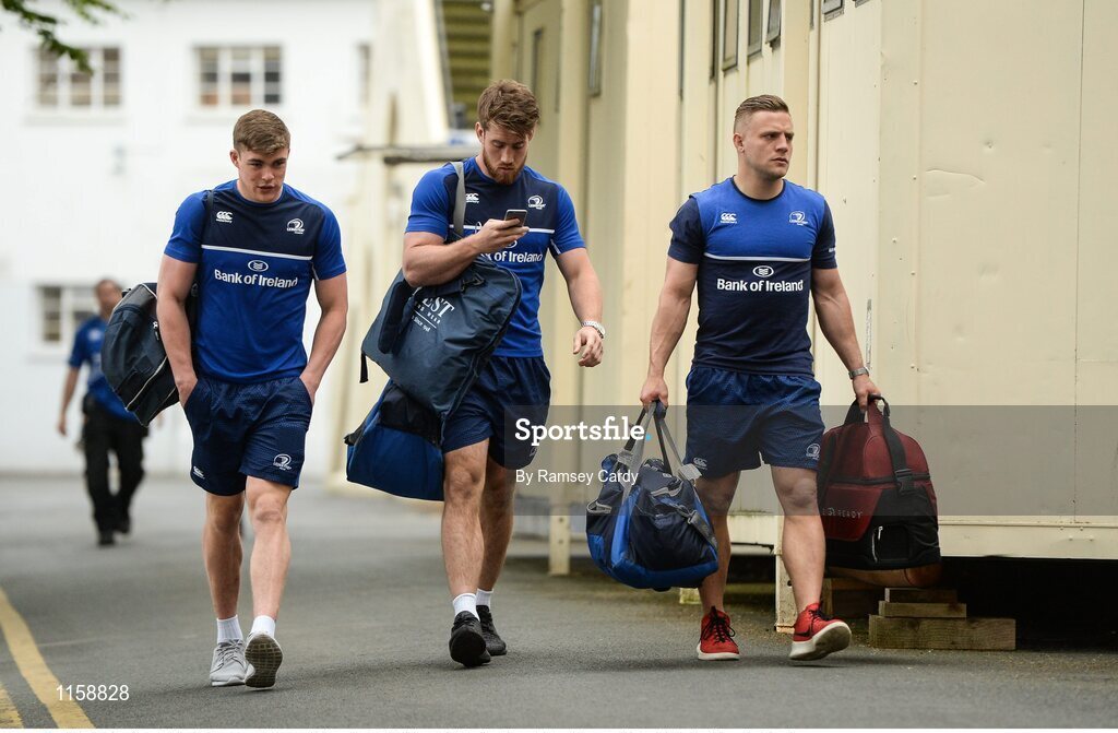 20 May 2016; Garry Ringrose, left, Dominic Ryan, centre, and Ian Madigan of Leinster arrive ahead of the Guinness PRO12 Play-off match between Leinster and Ulster at the RDS Arena in Dublin. Photo by Ramsey Cardy/Sportsfile