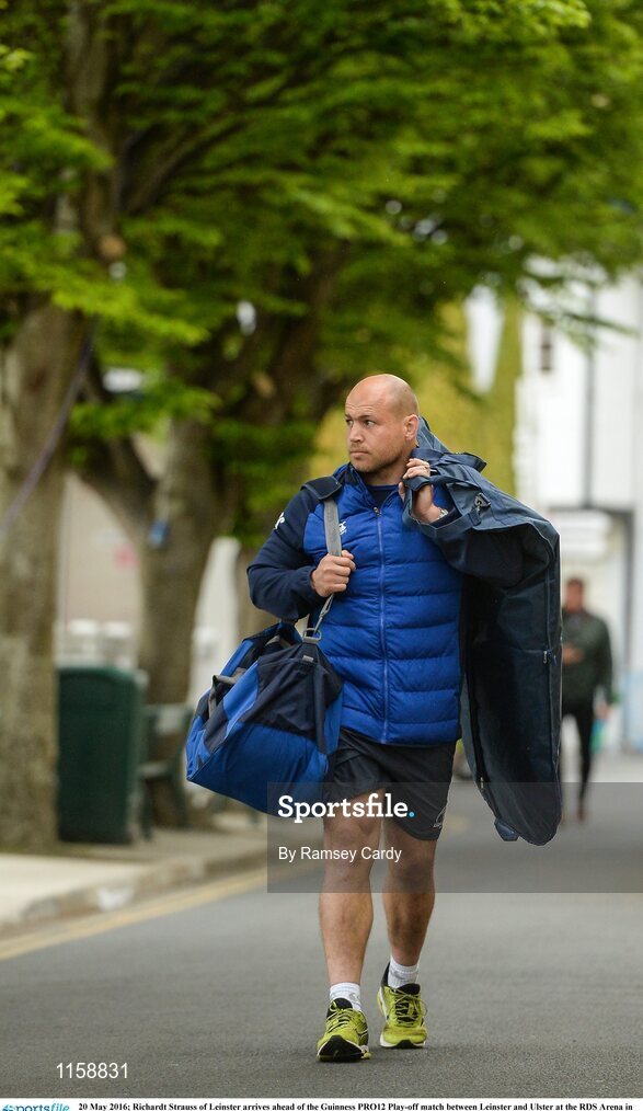 20 May 2016; Richardt Strauss of Leinster arrives ahead of the Guinness PRO12 Play-off match between Leinster and Ulster at the RDS Arena in Dublin. Photo by Ramsey Cardy/Sportsfile