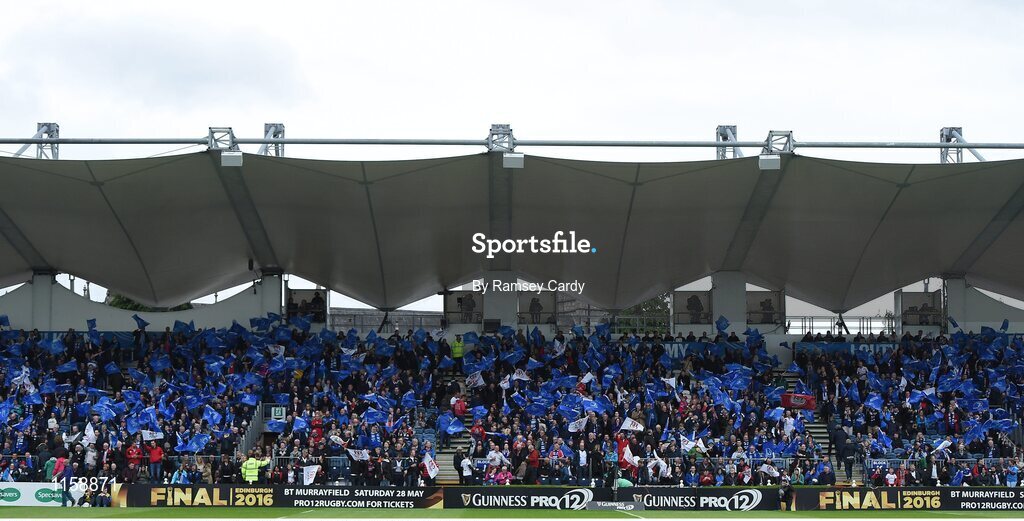 20 May 2016; Supporters wave flags ahead of the Guinness PRO12 Play-off match between Leinster and Ulster at the RDS Arena in Dublin. Photo by Ramsey Cardy/Sportsfile