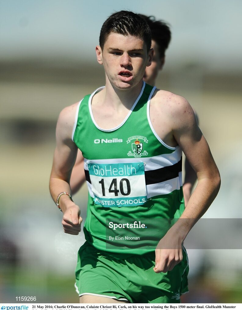 21 May 2016; Charlie O'Donovan, Colaiste Chriost Ri, Cork, on his way too winning the Boys 1500 meter final. GloHealth Munster Schools Track & Field Championships, Cork I.T, Cork. Photo by Eoin Noonan/Sportsfile