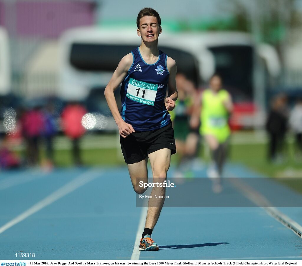 21 May 2016; Jake Bagge, Ard Scoil na Mara Tramore, on his way too winning the Boys 1500 Meter final. GloHealth Munster Schools Track & Field Championships, Waterford Regional Sports Centre, Waterford. Photo by Eoin Noonan/Sportsfile
