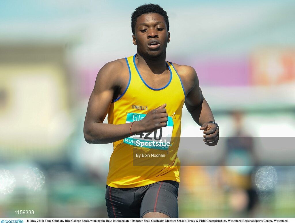 21 May 2016; Tony Odubote, Rice College Ennis, winning the Boys intermediate 400 meter final. GloHealth Munster Schools Track & Field Championships, Waterford Regional Sports Centre, Waterford. Photo by Eóin Noonan/Sportsfile