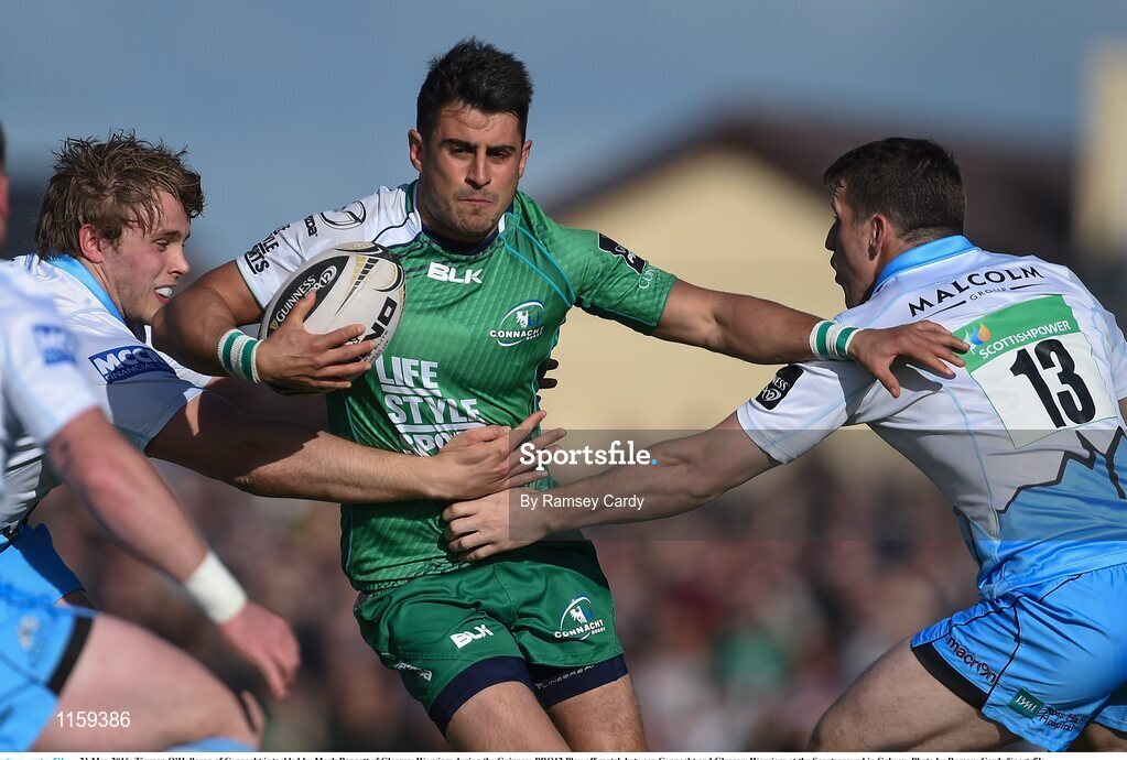 21 May 2016; Tiernan O’Halloran of Connacht is tackled by Mark Bennett of Glasgow Warriors during the Guinness PRO12 Play-off match between Connacht and Glasgow Warriors at the Sportsground in Galway. Photo by Ramsey Cardy/Sportsfile
