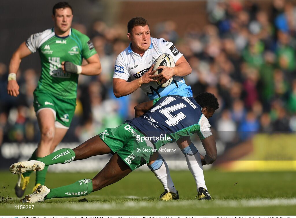 21 May 2016; Peter Horne of Glasgow Warriors is tackled by Niyi Adeolokun of Connacht during the Guinness PRO12 Play-off match between Connacht and Glasgow Warriors at the Sportsground in Galway. Photo by Stephen McCarthy/Sportsfile
