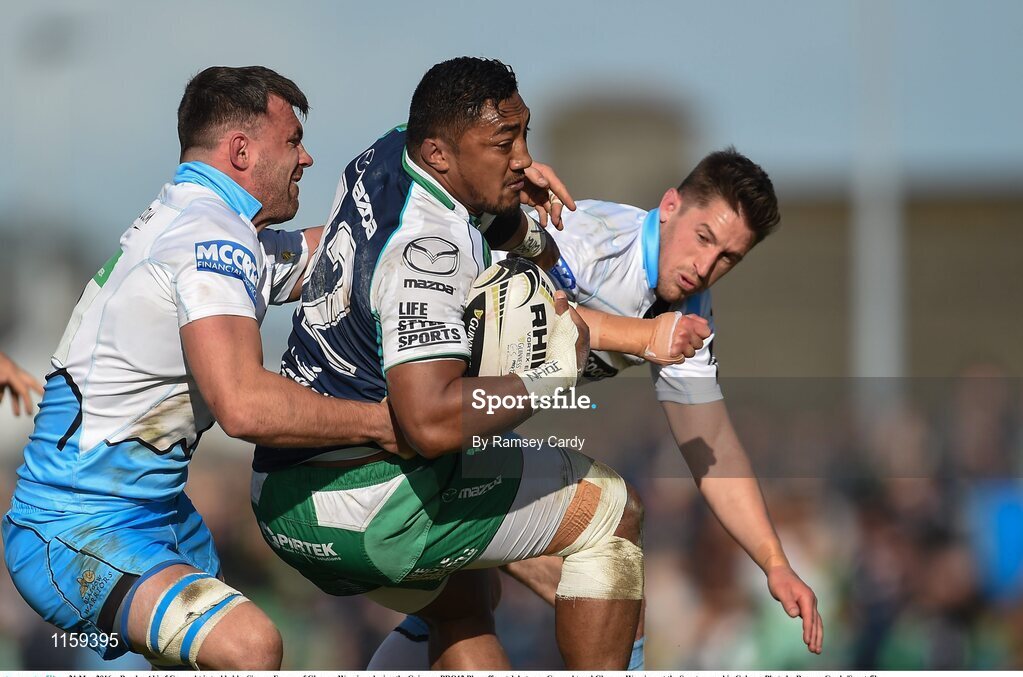 21 May 2016; Bundee Aki of Connacht is tackled by Simone Favaro of Glasgow Warriors during the Guinness PRO12 Play-off match between Connacht and Glasgow Warriors at the Sportsground in Galway. Photo by Ramsey Cardy/Sportsfile