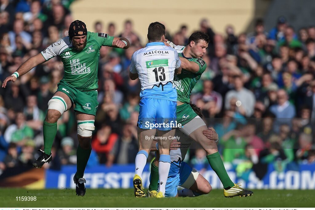21 May 2016; Robbie Henshaw of Connacht is tackled by Mark Bennett of Glasgow Warriors during the Guinness PRO12 Play-off match between Connacht and Glasgow Warriors at the Sportsground in Galway. Photo by Ramsey Cardy/Sportsfile
