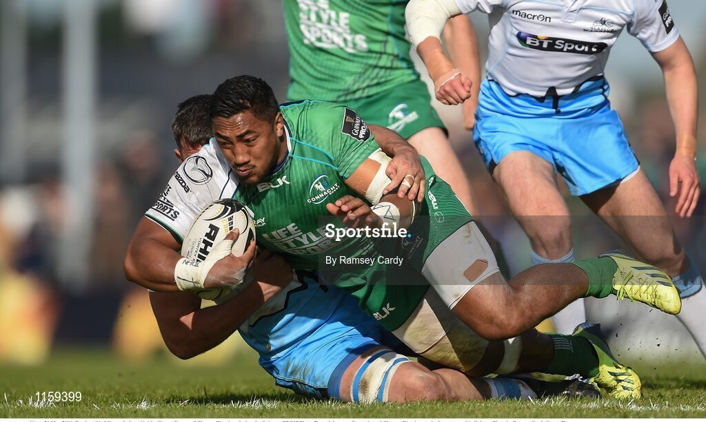 21 May 2016; Bundee Aki of Connacht is tackled by Simone Favaro of Glasgow Warriors during the Guinness PRO12 Play-off match between Connacht and Glasgow Warriors at the Sportsground in Galway. Photo by Ramsey Cardy/Sportsfile