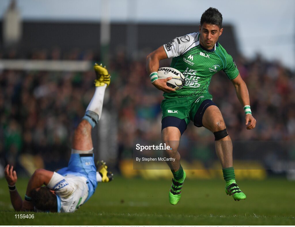 21 May 2016; Tiernan O'Halloran of Connacht escapes the tackle of Fraser Brown of Glasgow Warriors during the Guinness PRO12 Play-off match between Connacht and Glasgow Warriors at the Sportsground in Galway. Photo by Stephen McCarthy/Sportsfile